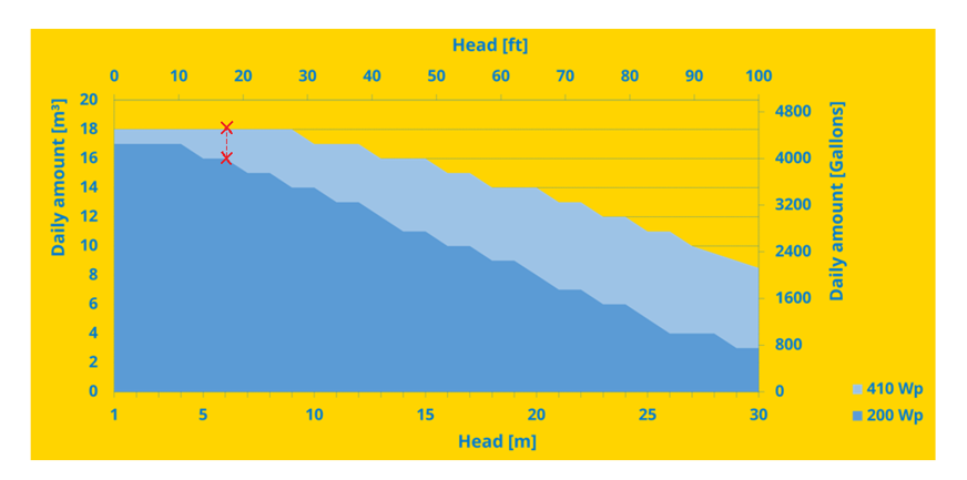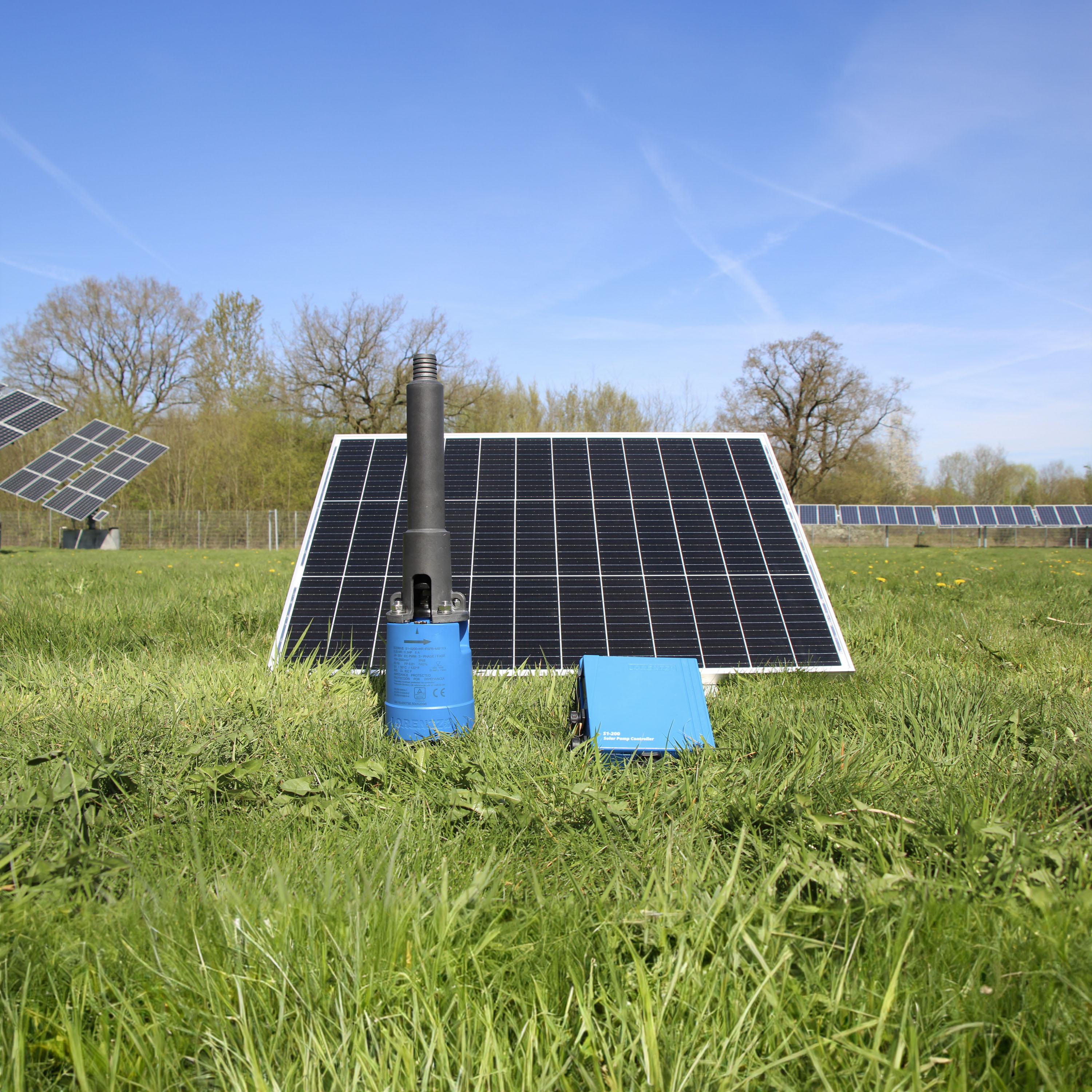 Die solarbetriebene Feldpumpe besteht im Wesentlichen aus einer Tauchpumpe, einem Steuermodul und zwei 100-Watt-Solarmodulen. Die Anlage kann mit einem zusätzlichen Set Solarmodulen erweitert werden, wenn Sie ein noch leistungsstärkeres System wünschen. Dies kann man überlegen, wenn das Wasser sehr hoch angehoben werden muss. Siehe das Flussdiagramm unter den technischen Spezifikationen.